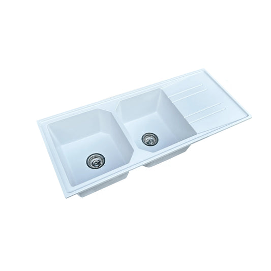 White Double Bowl Granite Kitchen Sink with Drainer, 1160x500x235mm (Model WGD11650)