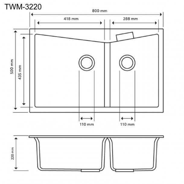 800 x 500 x 220mm Carysil CGDB3220 Double Bowl Granite Kitchen Sink Top/Flush Mount